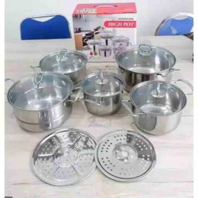 Menggunakan material Stainless dengan kualitas import dan tentunya Food gradeDengan karakteristik bahan yg tidak mudah terkikis, tidak beracun, menghisap dan memiliki ketahanan yg tinggiSatu set terdiri dari ukuran- panci ukuran 16cm- panci ukuran 18cm- panci ukuran 20cm- panci + steamer ukuran 22cm- panci + steamer ukuran 24cmKesemuanya dilengkapi dengan tutup