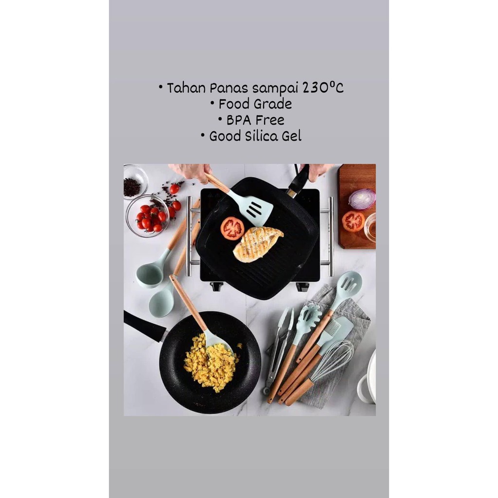 Size ( Detail on pict) :Lengkap dengan Box Wadah PremiumBahan : Silikon + pegangan kayu• Tahan panas sampai 230⁰• Food Grade• BPA Free• Good Silica GelSilicone Utensil Set ini terdiri dari 12 pcs alat dapur, cocok untuk semua jenis makanan. Dapat dipakai menumis, menggoreng, merebus, oles mentega dll.Bahan Food Grade, tahan panas, anti lengket, tahan lama, aman dan produk mudah dibersi