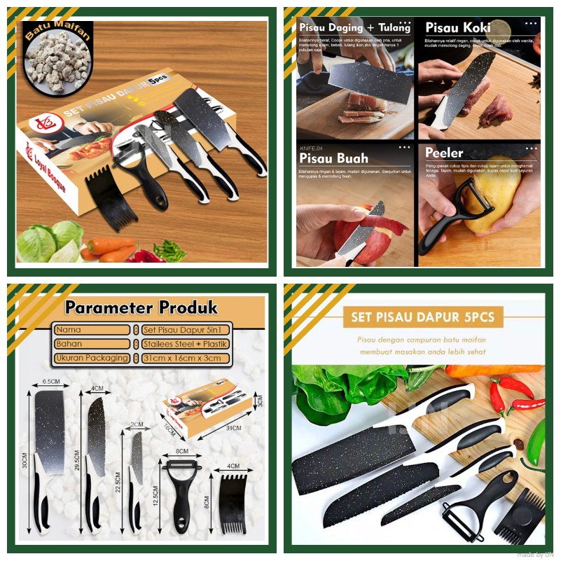 Set Pisau Dapur isi 5pcs Hitam / Pisau Set 5pcs Murah GrosirWarna RandomBUKAN RESELLER DAN DROPSHIP..PESAN DI HARI KERJA, LANGSUNG KAMI KIRIM DI HARI YANG SAMA (LAST ORDER JAM 15.00)Untuk Lokasi Surabaya dan sekitarnya, manfaatkan pengiriman barang dengan Gosend atau GRAB.Note: Hati - Hati produk tiruan dengan harga yanglebih murah.Jangan hanya karena selisih harga, Anda membeli produk palsu..Knife Set 5 Pcs + 1 Ceramic Peeler > 5pcs Knife Set ( Pisau Koki, 8" Pisau Roti, 8" Pisau Slice, 5" Pisau Utilitas, 3.5" Pisau Pengupas ) + 1 Pengupas Lapis Keramik.> Gagang dengan campuran batu maifan> Lapisan lapisan granit> Non Stick Coating Blade.> Dibuat untuk Koki Profesional.> Kemasan Kotak Cantik.> UKURAN PRODUK 31 X 16 X 3> UKURAN PAKET 32 X 17 X 4BERAT 260GRAMKeunggulan produk:- Dengan mata pisau berbahan dasar Stainless steel yang tajam- Lapisan anti lengket- Pegangan pisau yang tidak licin / anti slip dan ergonomis- Fitur pelindung jari untuk keamanan dan kenyamanan dalam mengenggam- Mata pisau anti bakteri- Lekukan - lekukan di mata pisau, untuk membantu melepaskan bahan makanan yang tipis setelah dipotongCatatan saat menggunakan:- Jangan meninggalkan produk di dekat api- Jangan membersihkan mesin cuci piring- Jangan mengambil risiko menggunakan tangan Anda untuk menguji ketahanan pisau Anda untuk menghindari cedera- Jauhkan produk dari jangkauan anak-anak- Bersihkan dan keringkan produk setelah digunakan untuk menghindari karat- Hanya gunakan tujuan dasarPENTING!!* Semua produk akan dicek dari bagian luarnya, karena segel dari pabrik ** TIDAK ADA GARANSI kerusakan atau cacat jika di dalam segel ** ATC = Membaca dan Menyetujui!!! * No COMPLAIN, No RETUR dengan alasan a