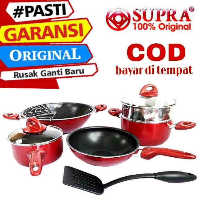 GARANSI: PANCI SET 9 PC SUPRA Termasuk Langseng TIRISAN MINYAK Spatula - PENGGORENGAN 9pcs-----------------------------------------------------------------------------------------------------------SUPRA ADALAH MERK TERPECAYA DISELURUH PENJURU NUSANTARA-----------------------------------------------------------------------------------------------------------Panci Set Serba Guna yang terbuat dari bahan TeflonDi coating dengan teflon yang berkualitas, sehingga tidak mudah terkelupas dan anti karatLengkap dengan Kukusan, Wajan dan PenggorenganPanci Set Supra Rosemary 9 Pcs terdiri dari :Panci 9pcs Supra- Saucepan 16cm- Tutup Kaca 16cm- Dutch oven 20cm- Tutup Kaca 20cm- Steamer 20cm- Mini Wok 22cm- Wok 30cm- Wire Rak / Jaring Iris- Sodet nylon - Packing Free bubble + Doubl