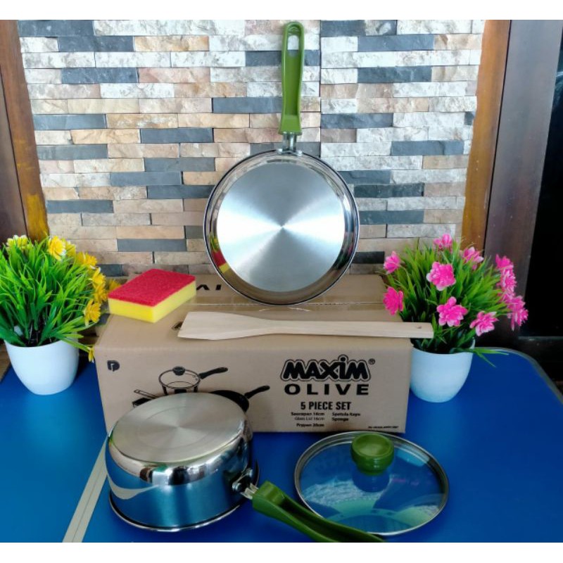 Alat Masak Ekonomis & Multifungsi Untuk Sehari-hari Set frying pan dan panci dengan bahan stainless steel yang kuat dan tebal. Frypan Maxim melayani dengan lapisan non-stick 2 lapisan, sehingga tidak lengket saat digunakan untuk menggoreng.Alat masak ini sangat cocok digunakan sehari-hari karena multifungsi dan ekonomis. Masakan jadi lebih cepat matang merata, hemat gas, dan hemat waktu.1 set terdiri dari:- Frypan uk. 20 cm dengan lapisan anti lengket 2 lapis dan Impact Bottom- Saucepan uk. 16 cm + Tutup Kaca- Spatula Kayu- Sponsselamat berbel