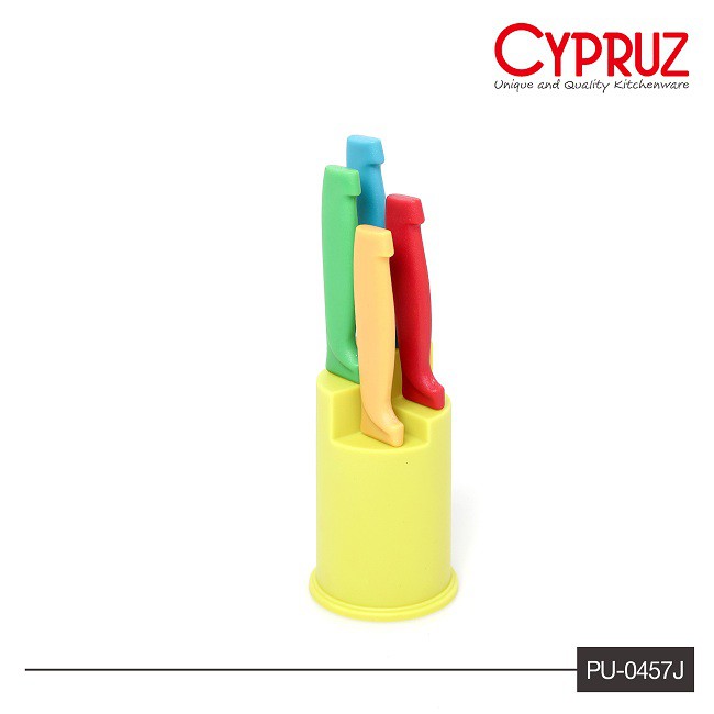 Cypruz Pisau Set + Tempat PU-0457J - Pisau warna set + Tempat. 1 set isi 4 pisau.Terdiri dari :- Rak berbahan plastik- 1 buah fruit knife (warna biru)- 1 buah paring knife (warna merah)- 1 buah soft knife (warna hijau)- 1 buah solid cutter (warna kuning)Memudahkan proses memasak dan mengubah kualitas masakan