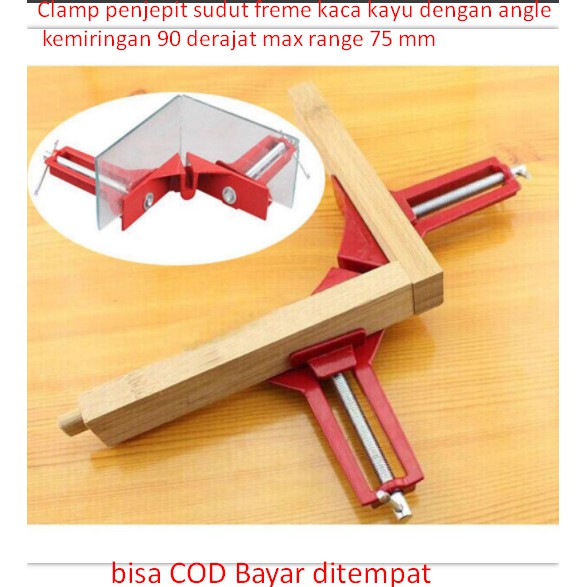 Clamp penjepit sudut freme kaca kayu dengan angle kemiringan 90 derajat max range 75 mmAlat ini berfungsi untuk menjepit kayu kaca dan benda lainnya biasanya di pakai tukang kayu saat mereka membuat sudut kotak yang sempurna dengan sudut kemirigan 90 deraja