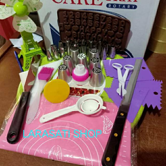 Paket dekorasi lengkap terdiri dari Meja putar kue merk Maspion warna random silicon Angka + Happy Brithday/alphabet 20 pcs spuit wilton lokal motif campur 7 pcs spuit rusia original 3 pcs scraper import warna random 10 lembar plastik segitiga / piping bag gunting mawar kuas silicone warna random paku mawar plastik head coupler spuit rusia pemisah kuning telur pisau roti polos dan gerigi spatula butter cream silmat /silpat silicone warna random. Happy shopping & Happy Baking
