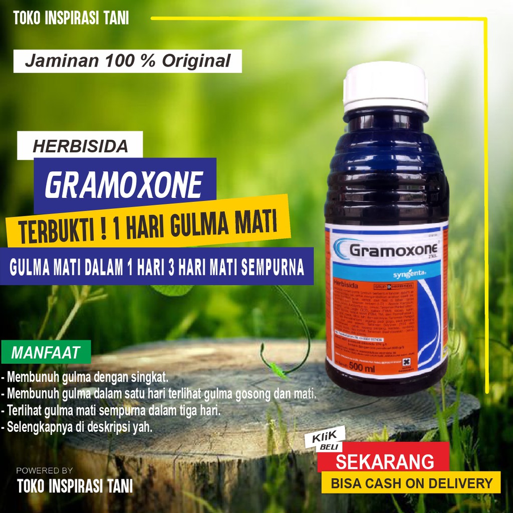 Bisa COD Gramoxone Herbisida Kemasan 500 ml/Herbisida Gromoxone Kemasan 500 ml/Obat Pengndali Gulma---------------------------------------Bismillahirrahmanirrahim INSPIRASI TANI----------------------------------------Herbisida GromoxoneKemasan : 500 ml(Grosiran/Partai Besar Harga Bisik2 Chat Aja Yahh)AWASS!!! PRODUK TIRUAN DENGAN HARGA MURAH PASTIKAN DAPAT PRODUK ORIGINAL ,TIDAK ORIGINAL UANG KEMBALI !!!HANYA DI TOKO INSPIRASI TANI------------------------------------------------------------------------------------------------------------------------------------------------Gramoxone adalah herbisida purna tumbuh yang bersifat kontak dan berbentuk larutan warna hijau tua serta diproduksi oleh Syngenta di banyak negara, termasuk Indonesia. Sifat kontak yang dimaksud pada Gramoxone adalah, bagian yang tersemprot Gramoxone akan mati atau gosong dalam waktu yang singkat, hanya 1 hari saja gulma akan terlihat gosong dan dalam waktu 3 hari gulma diklaim bisa mati sempurna.Produk ini disebut-sebut sebagai jenis herbisida dengan kecepatan atau efek yang pasti. Jadi, sekali penggunaan, dapat langsung terlihat jelas efeknya. Gramoxone memiliki kandungan bahan aktif parakuat diklorida 276 g/l, kemudian dikemas dalam kemasan yang wujudnya bervariasi, yakni mulai dari botol plastik untuk Gramoxone ukuran kecil, kemudian ada juga yang dikemas dalam jerigen untuk Gramoxone ukuran sedang, serta kemasan drum untuk Gramoxone ukuran paling besar.Dosis & Cara Pemakaian Gramoxone : Cara pemakaian Gramoxone pun cukup mudah, pengguna tinggal melarutkan sekitar 100-150 cairan Gramoxone ke dalam 15 liter air, kemudian semprotkan pada gulma yang mengganggu. Dalam jangka waktu 1-3 hari, gulma dijanjikan akan mengering dengan sendirinya. Dosis yang perlu diperhatikan untuk penggunaan Gramoxone dalam rangka menyingkirkan gulma berdaun lebar bisa dengan memakai dosis atau takaran 1,5 liter hingga 3 liter per hektare. Sementara itu, untuk gulma berdaun sempit, takaran penyemprotannya bisa dengan dosis 2,5 liter hingga 5 liter per hektar.Gramoxone diklaim tak akan menimbulkan efek negatif pada tanaman yang mempunyai batang keras seperti tanaman kakao, karet, kapas, ubi kayu, atau sejenisnya. Selain itu, Gramoxone juga dapat dimanfaatkan untuk penyemprotan dengan volume tinggi pada lahan tanpa tanaman. Namun, produk pembasmi gulma ini dikategorikan dalam klasifikasi bahaya WHO kelas II, sehingga sangat berbahaya bila tertelan oleh makhluk hidup, karena dapat menyebabkan keracunan lewat mulut, kulit, dan pernapasan.Petunjuk Penggunaan sudah tertera di kemasan produk yah.YUK SOBAT INSPIRASI TANI langsung aja di order Produk-produk yang ada di etalase toko kami,kami doakan ya temen temen inspirasi tani semoga tanamannya tumbuh subur, sehat dan panen melimpah.