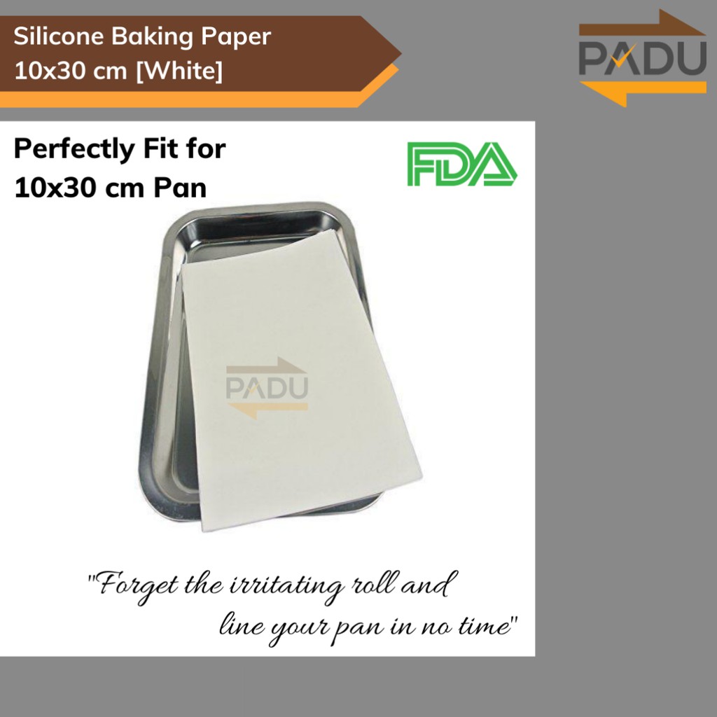 Silicone Baking Paper (White) 10 cm x 30 cm , ketebalan 40 gsmMin. Order: 1 Pack = 20 lembarMengapa menggunakan Silicone Baking Paper?- Dapat digunakan berulang kali s/d 10 kali, tergantung pemakaian- Permukaan kertas yang sangat licin, sehingga kue atau roti dan bahan makanan lainnya tidak akan lengket pada permukaan kertas- Hasil pemanggangan menjadi lebih sempurna- Hasil kukusan menjadi lebih baik- Makanan mudah dikeluarkan dari wadah kukus / loyang panggang- Berbahan Food Grade, sehingga aman dan dapat menjaga kualitas kebersihan dari makanan yang dipanggang atau dikukusDijamin termurahhhh !!!Pengiriman Padu Paperindo beroperasi setiap hari Senin - Sabtu:- Senin - Jumat (Invoice yang masuk sebelum jam 15.00 WIB, dikirim pada hari yang sama)- Sabtu (Invoice yang masuk sebelum jam 13.00 WIB, dikirim pada hari yang sama)*Hari Libur Nasional dan Minggu tidak ada pengiriman*Invoice yang masuk melewati batas waktu yang kami infokan, dikirimkan pada keesokan ha