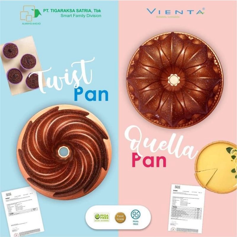 Cookware di Rumah Sudah Teruji Aman? Zat-zat berbahaya pada cookware dapat bermigrasi ke makanan yang kita konsumsi loh !Dampak jangka panjang : AlzheimerKankerPenyakit GinjalPastikan Memilih Cookware yang Teruji Aman!Kini hadir produk baru dari Vienta yaitu TWIST PAN & QUELLA PAN 6 KEUNGGULAN TWIST PAN & QUELLA PAN 1. Marble Non-Stick Coating 2. Material Tebal dan Kokoh 3. Ergonomis dan Kekinian 4. Aman, Kualitas Produk Teruji 5. Multifungsi 6. InvestasiJangka PanjangTWIST PANBerat produk : 510 gram Berat dimensi : 1 kg Bahan : Alumunium Alloy 383 Coating : Non Stick Dimensi Produk : 24 x 24 x 8,8 cm Dimensi Box : 24,5 x 24,5 x 10 cmQUELLA PANBerat produk : 500 gram Berat dimensi : 1 kg Bahan : Alumunium Alloy 383 Coating : Non Stick Dimensi Produk : 24 x 24 x 9,5 cm Dimensi Box : 24,5 x 24,5 x